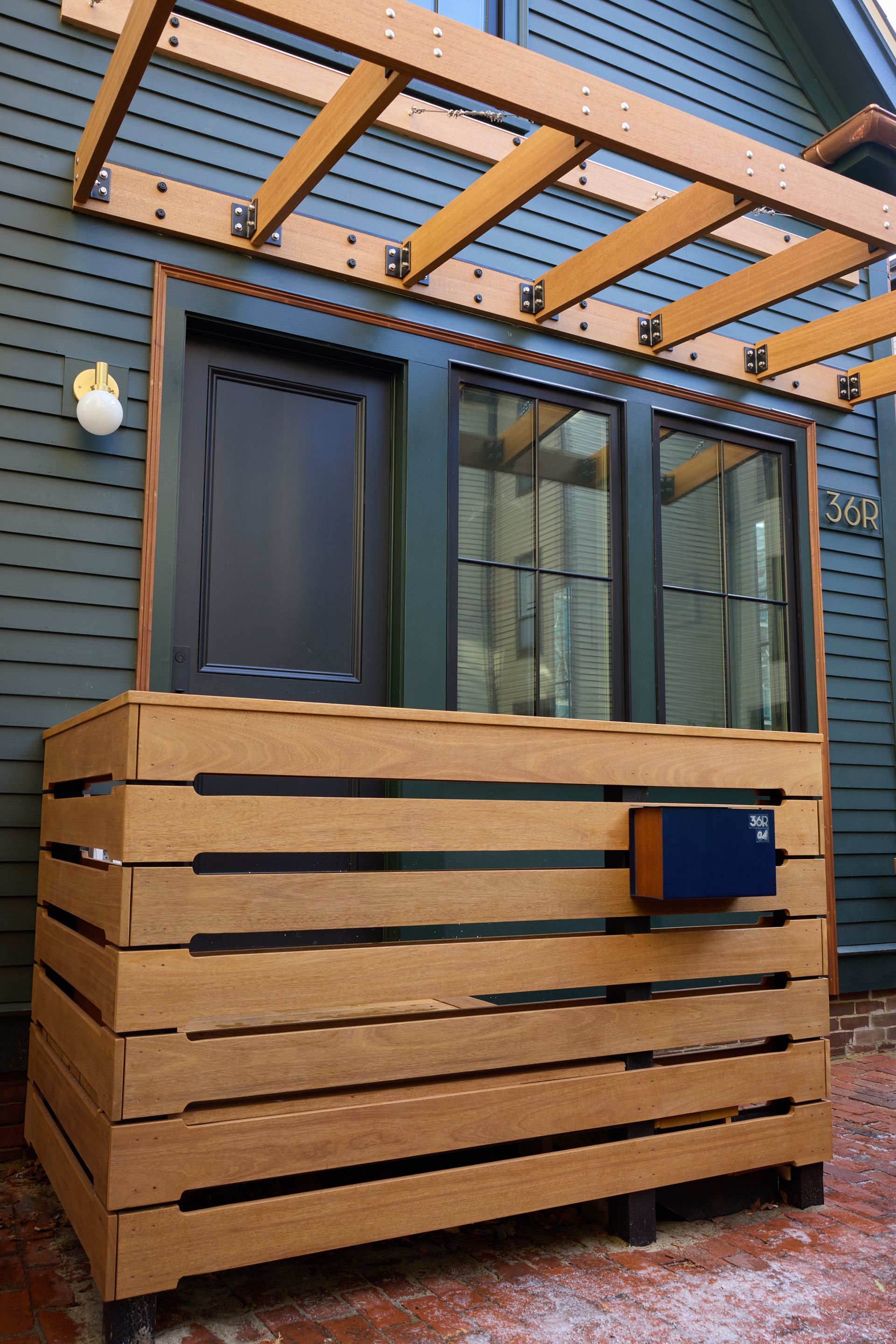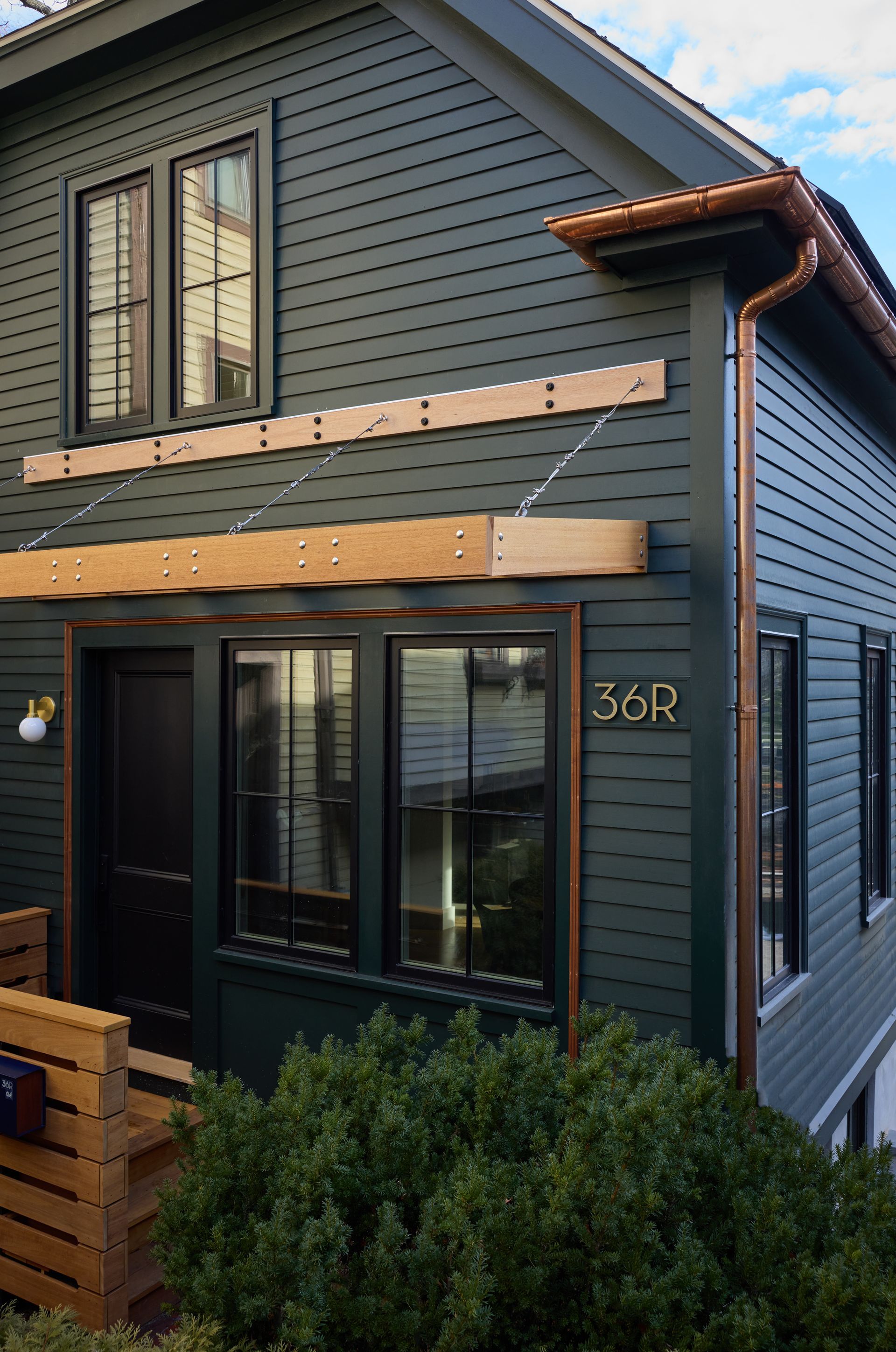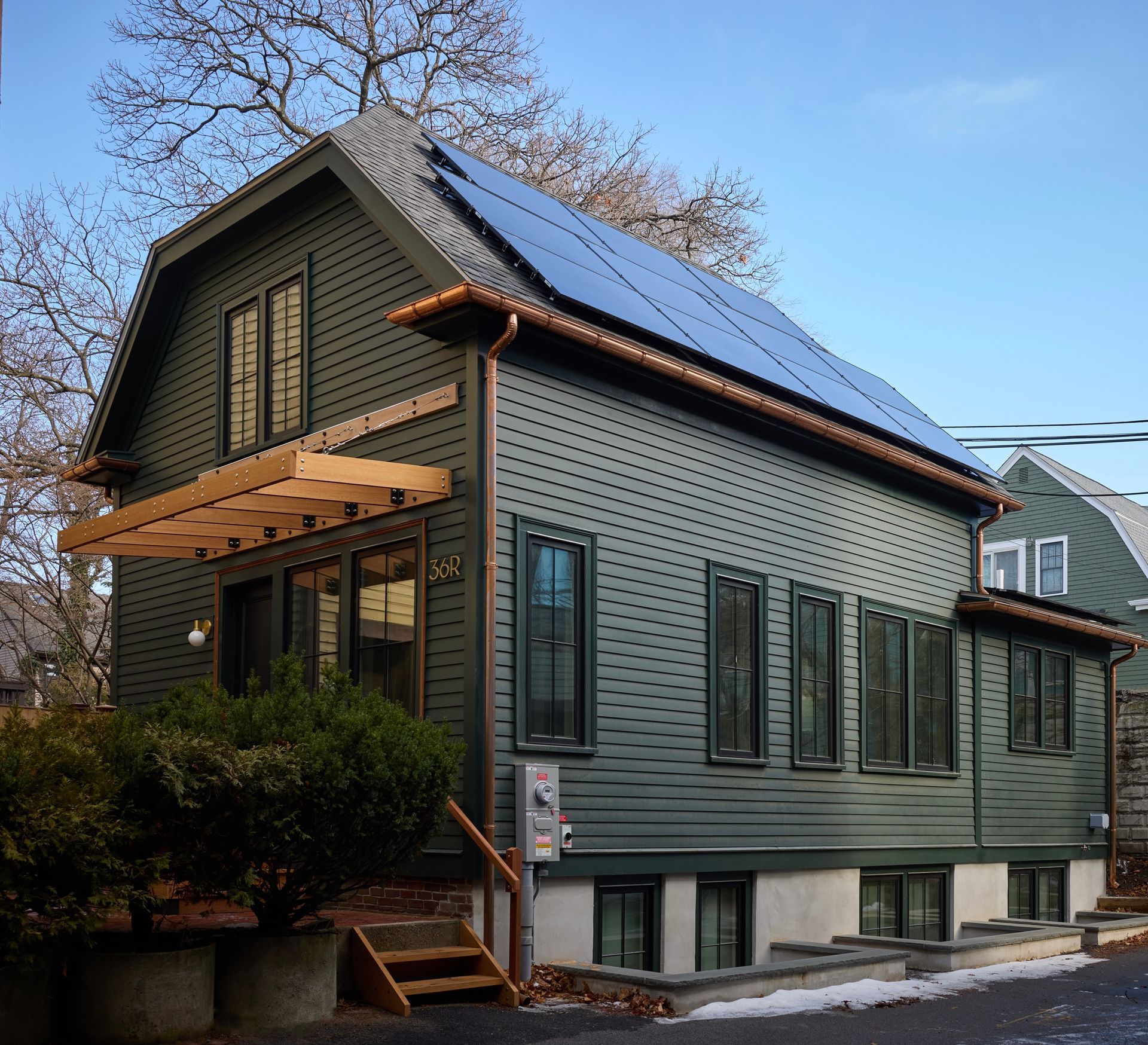 What began as a proud but time-worn 1890s carriage house has been fully reimagined into a modern, energy-forward home—while honoring every bit of its historic charm. This project was a complete structural rebirth: every stud, joist, rafter, and bearing beam was replaced and thoughtfully overbuilt to bring new strength to an old soul. Outside, the home was wrapped in crisp new cedar clapboard siding and Boral trim, paired with Marvin Ultimate triple-pane windows for exceptional efficiency. A Marvin French door opens to the patio, while the custom Sapelle front door—fitted with Emtek hardware—makes a warm and confident first impression. The front entry is echoed by a Sapelle landing, staircase, and overhang, tying the exterior together with natural richness. A new roof now carries an 8.925 kW DC solar array feeding three Enphase batteries, providing 14.64 kWh of backup power and generating roughly 7,967 kWh per year. Copper gutters and downspouts add a timeless finishing touch to the renovated façade.
