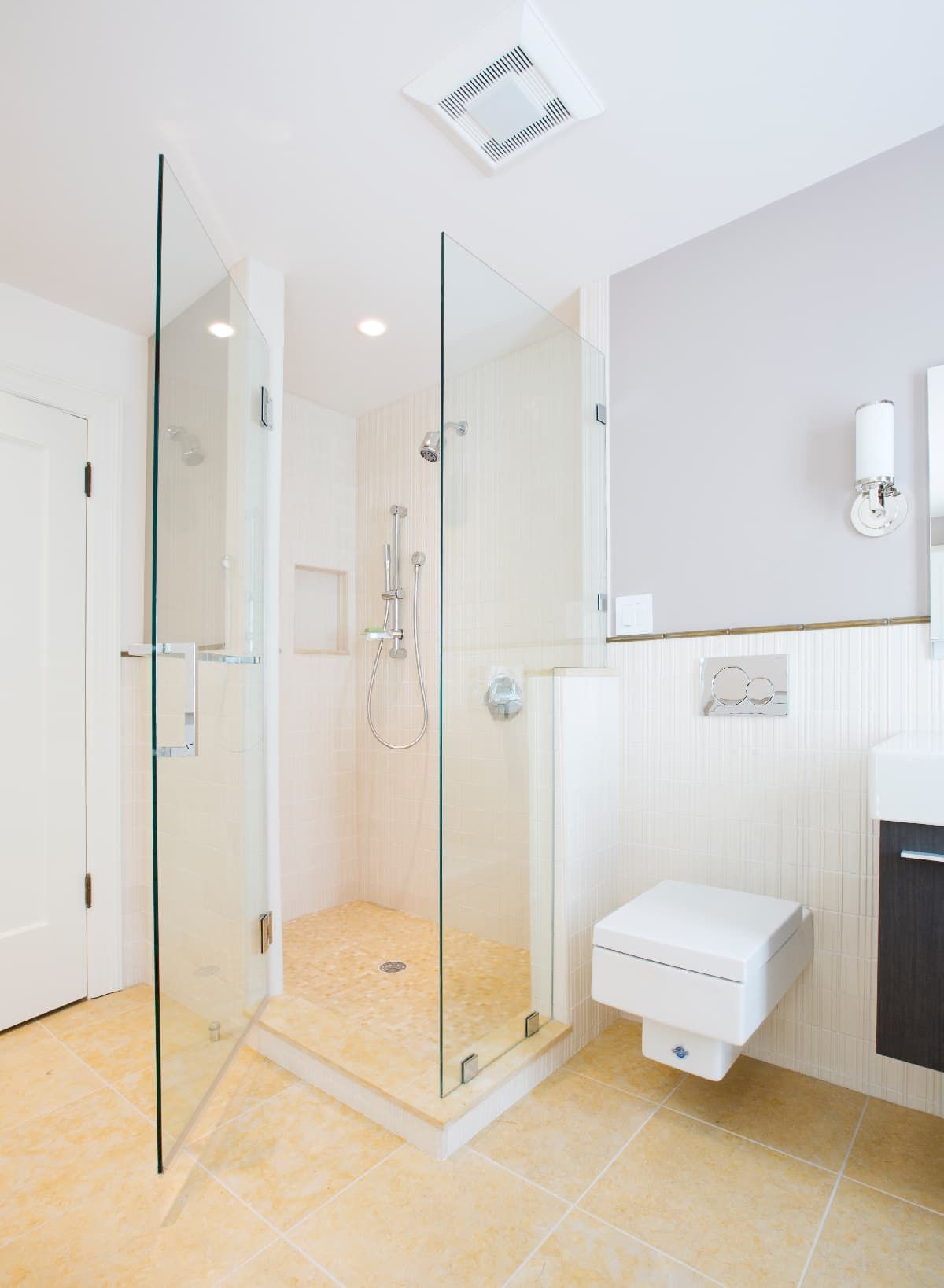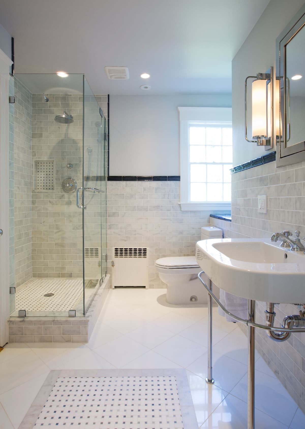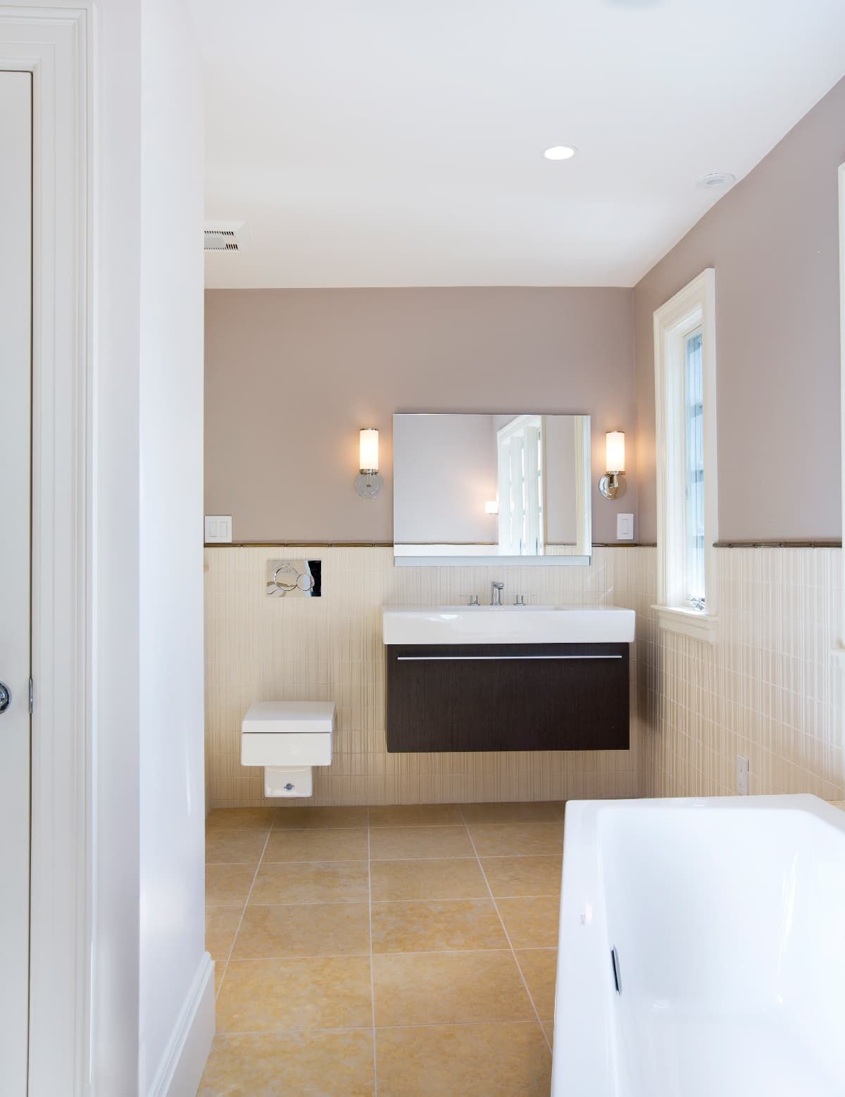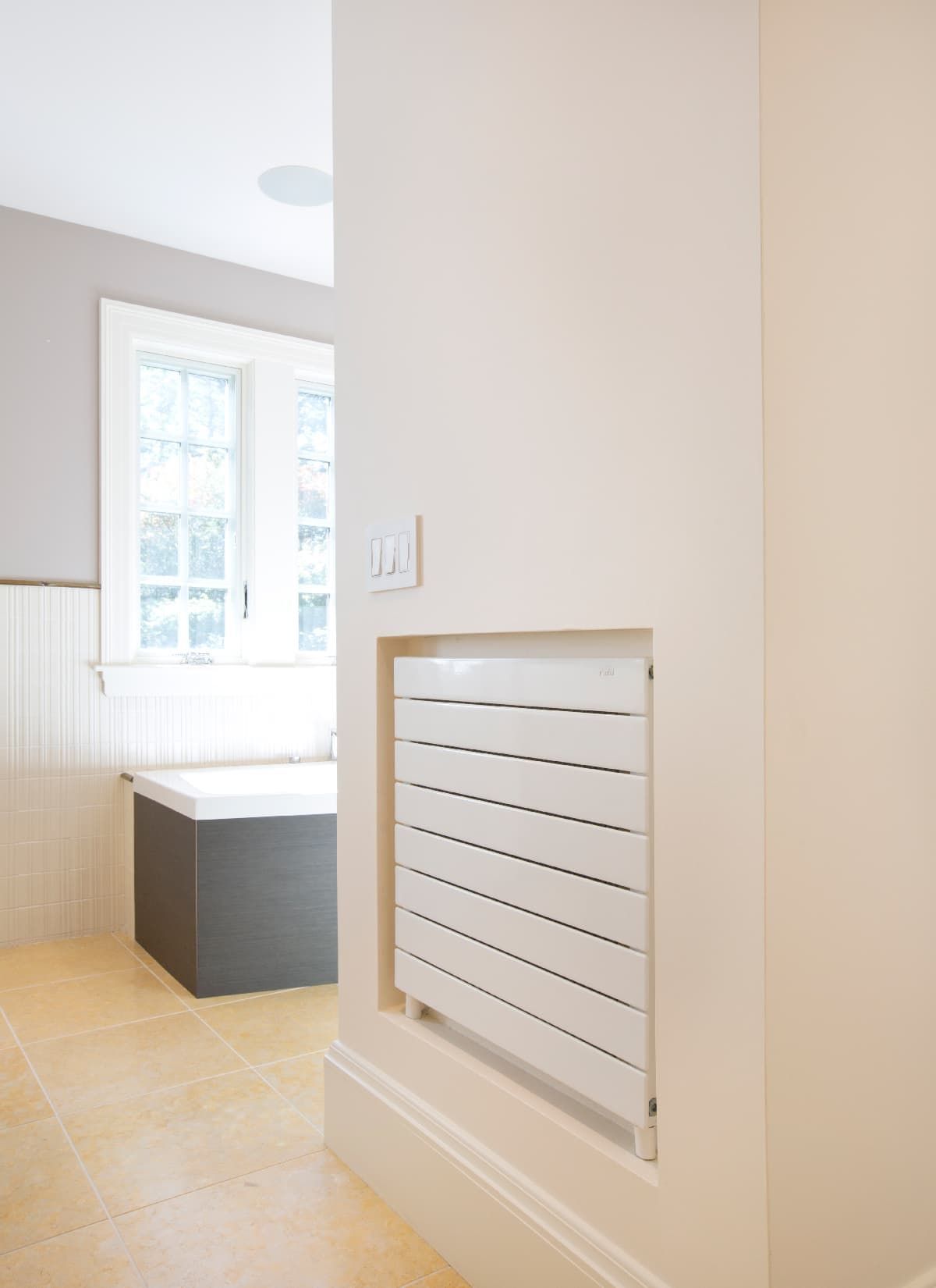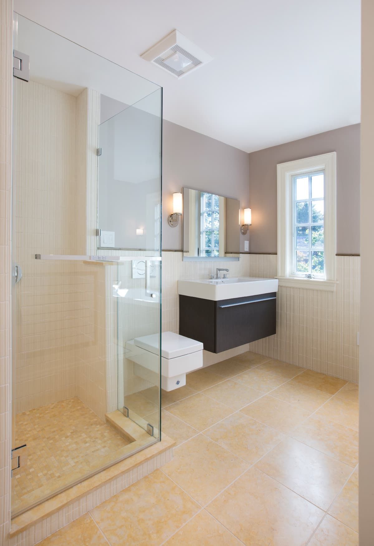 A central element of this Gambrel renovation was the thorough reimagining of the five bathrooms. In both the primary bath and the powder room, the homeowners opted for modern wall-hung toilets. The Duravit toilet tanks are elegantly concealed within the wall, making the toilets appear to float in the space. We engineered a robust 2x6 steel structure to support each commode and its user. To enhance the size of the primary bathroom, we combined two smaller rooms, making way for a luxurious stand-alone tub and a stunning glass wall shower enclosure. To ensure ultimate comfort, we incorporated a radiant floor heating system.