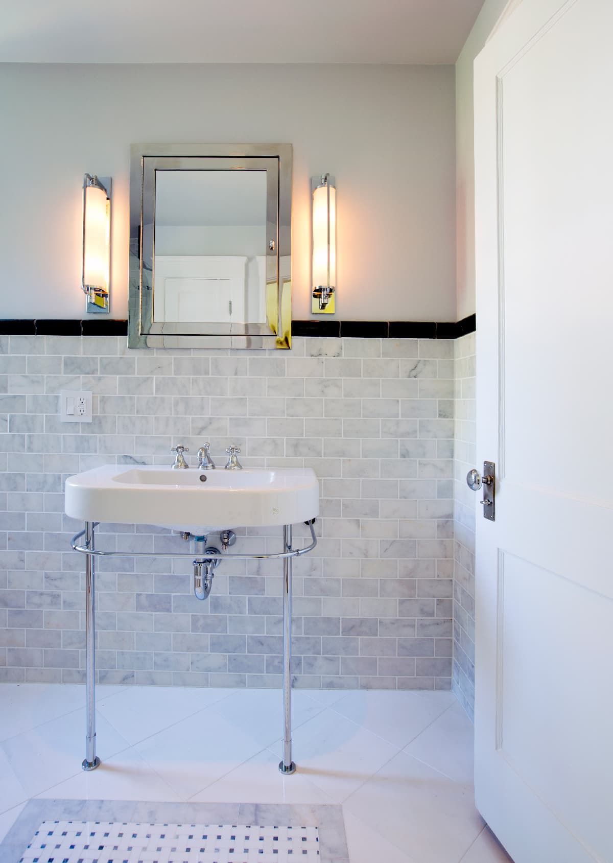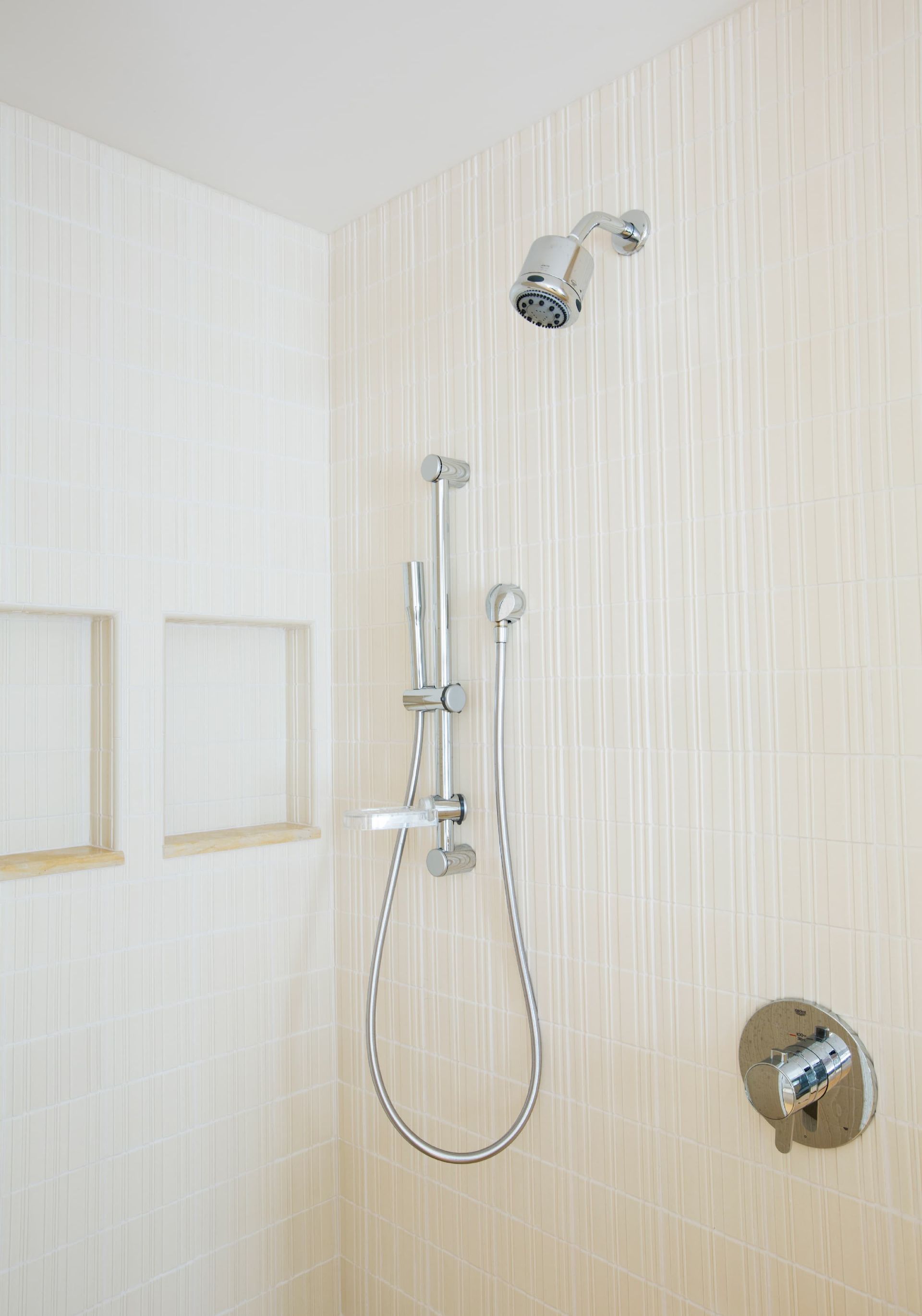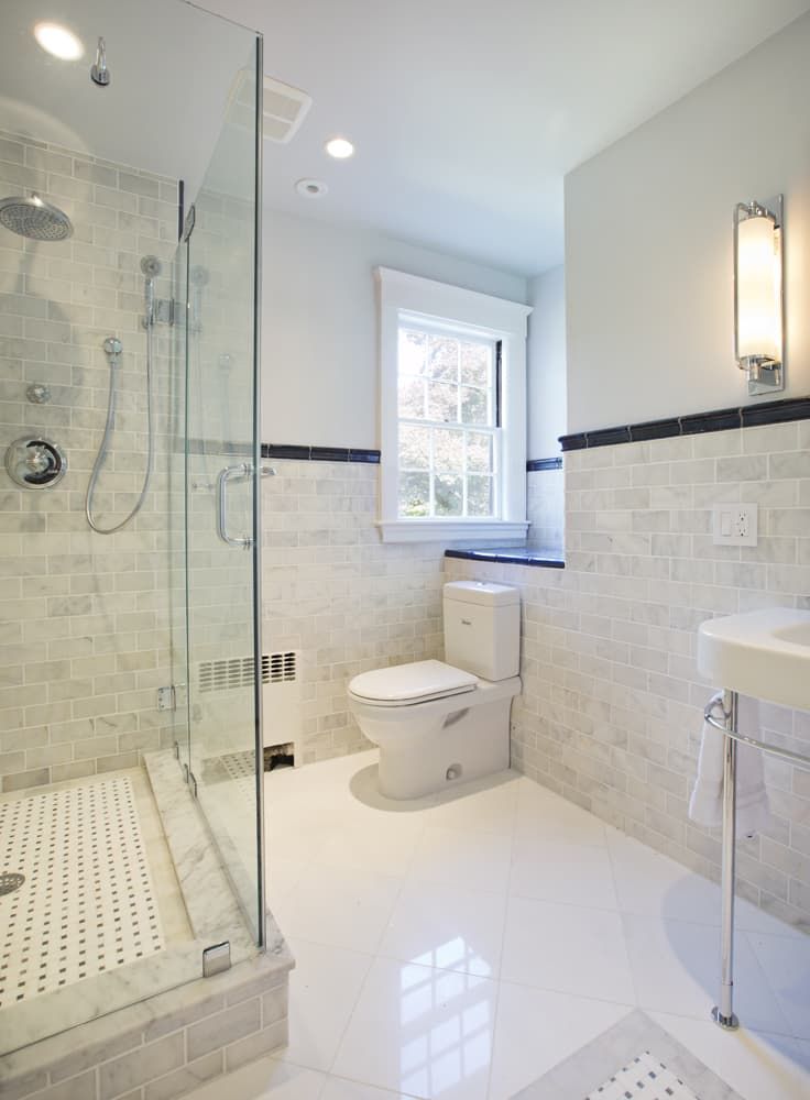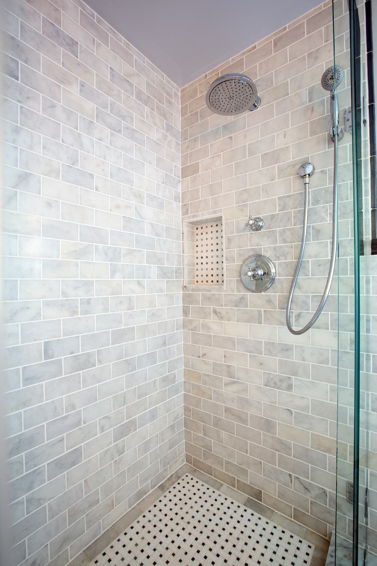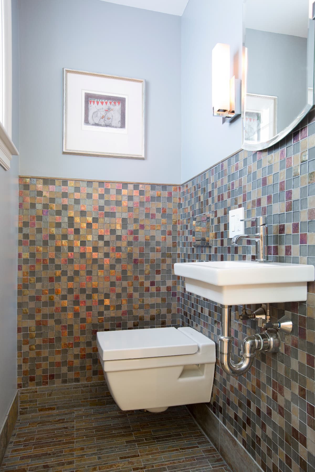 A central element of this Gambrel renovation was the thorough reimagining of the five bathrooms. In both the primary bath and the powder room, the homeowners opted for modern wall-hung toilets. The Duravit toilet tanks are elegantly concealed within the wall, making the toilets appear to float in the space. We engineered a robust 2x6 steel structure to support each commode and its user. To enhance the size of the primary bathroom, we combined two smaller rooms, making way for a luxurious stand-alone tub and a stunning glass wall shower enclosure. To ensure ultimate comfort, we incorporated a radiant floor heating system.