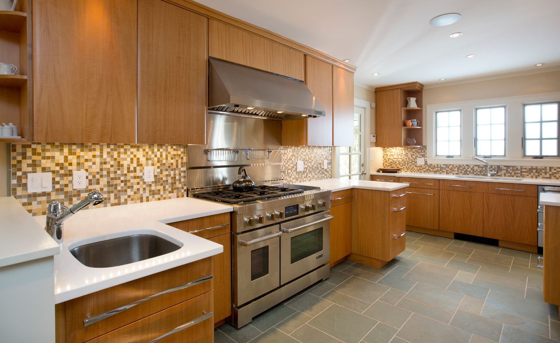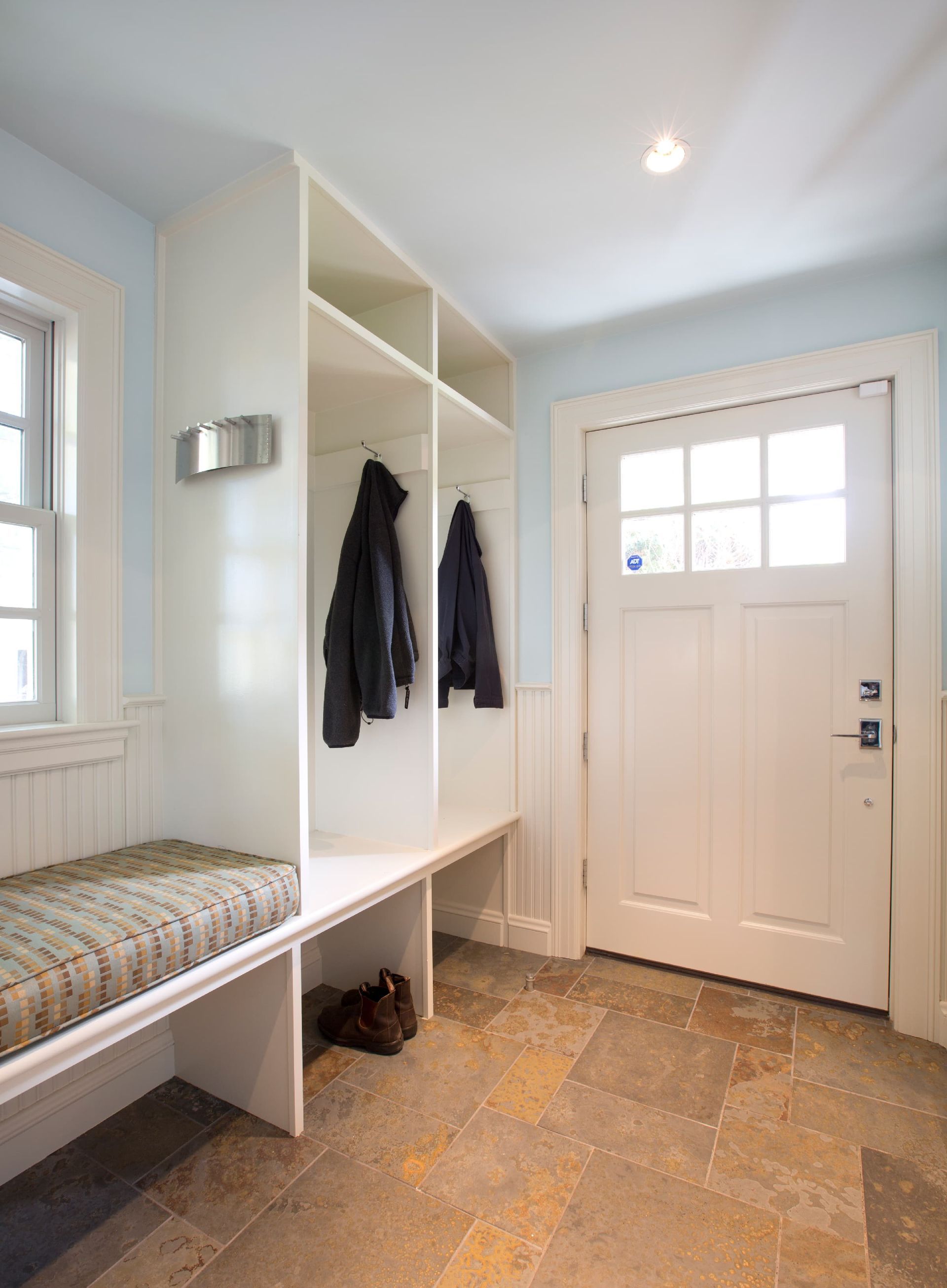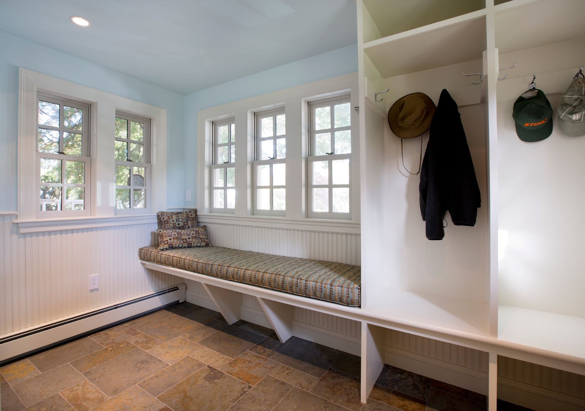 Among the features the homeowners envisioned for this renovation was a mudroom. To fulfill this request, we added an extension to accommodate the spacious new mudroom. The freshly built cedar deck above offers the homeowners a perfect private retreat. The mudroom is equipped with built-in seating and storage cubbies, ideal for winter coats, boots, sports gear, and more.